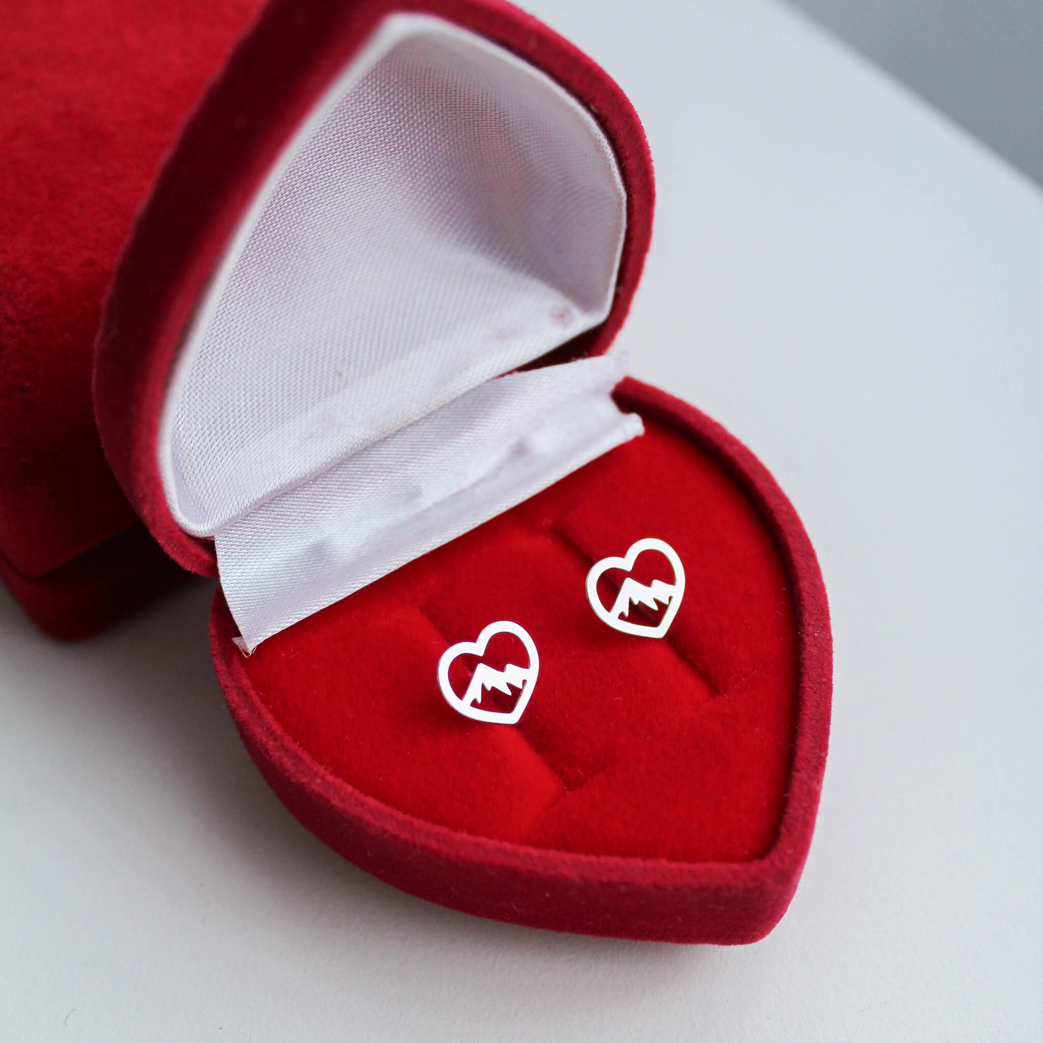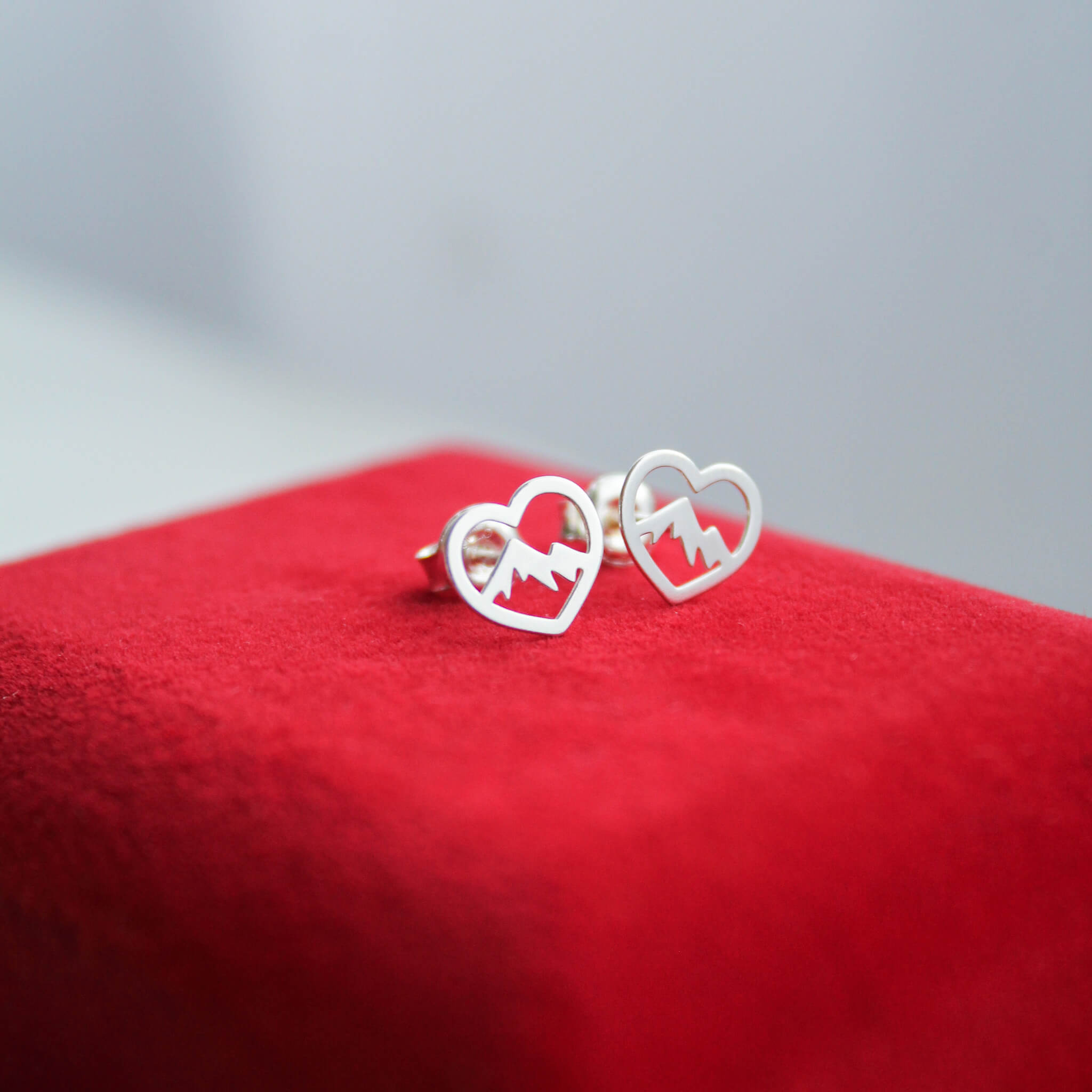 Minimalistyczne kolczyki w kształcie serca z motywem gór.