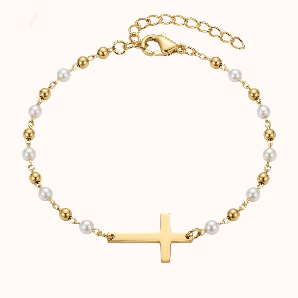 Złota Bransoletka z Krzyżykiem z Perełkami Stal